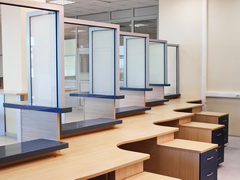 Столешница и полка для вещей клиента изготовлены из темного искусственного камня. Стеклянные перегородки создают комфортное рабочее пространство для сотрудников. Применен необычный эргономичный дизайн пространства - барьерная стойка выполнена ступенями, что естественным образом, без дополнительных конструкций, создает выделенное автономное место для посетителя вокруг каждого клиентского окна.