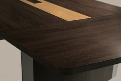 Столешница изготовлена из материалов массивного ЛДСП высокого качества приятного глубокого цвета венге и вставка посередине из выбеленного дуба с блоком розеток для питания ноутбуков и сотовых участников конференции.