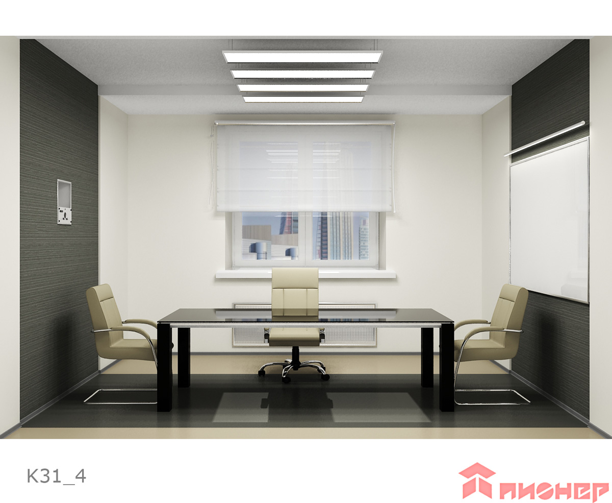 Стеклянный стол на опорах из искусственного камня призван внести атмосферу изысканности и элегантности переговорной зоны в офисе