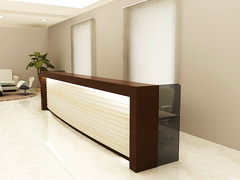 Как известно, гладкость и прямолинейность фактуры ярче ощущается в противоречии с неровными, ребристыми поверхностями. Именно на этом контрасте (помимо цветового) построен дизайн этой стойки ресепшн.