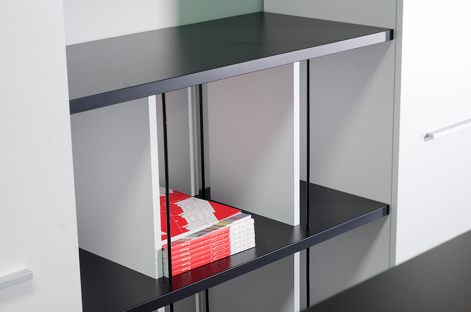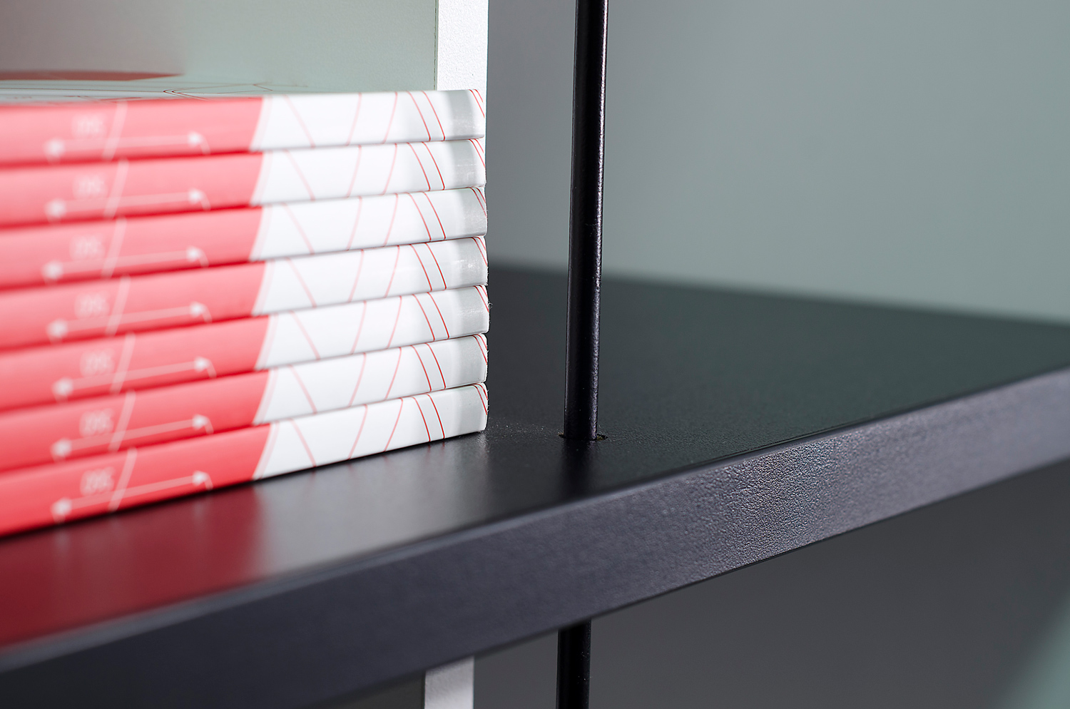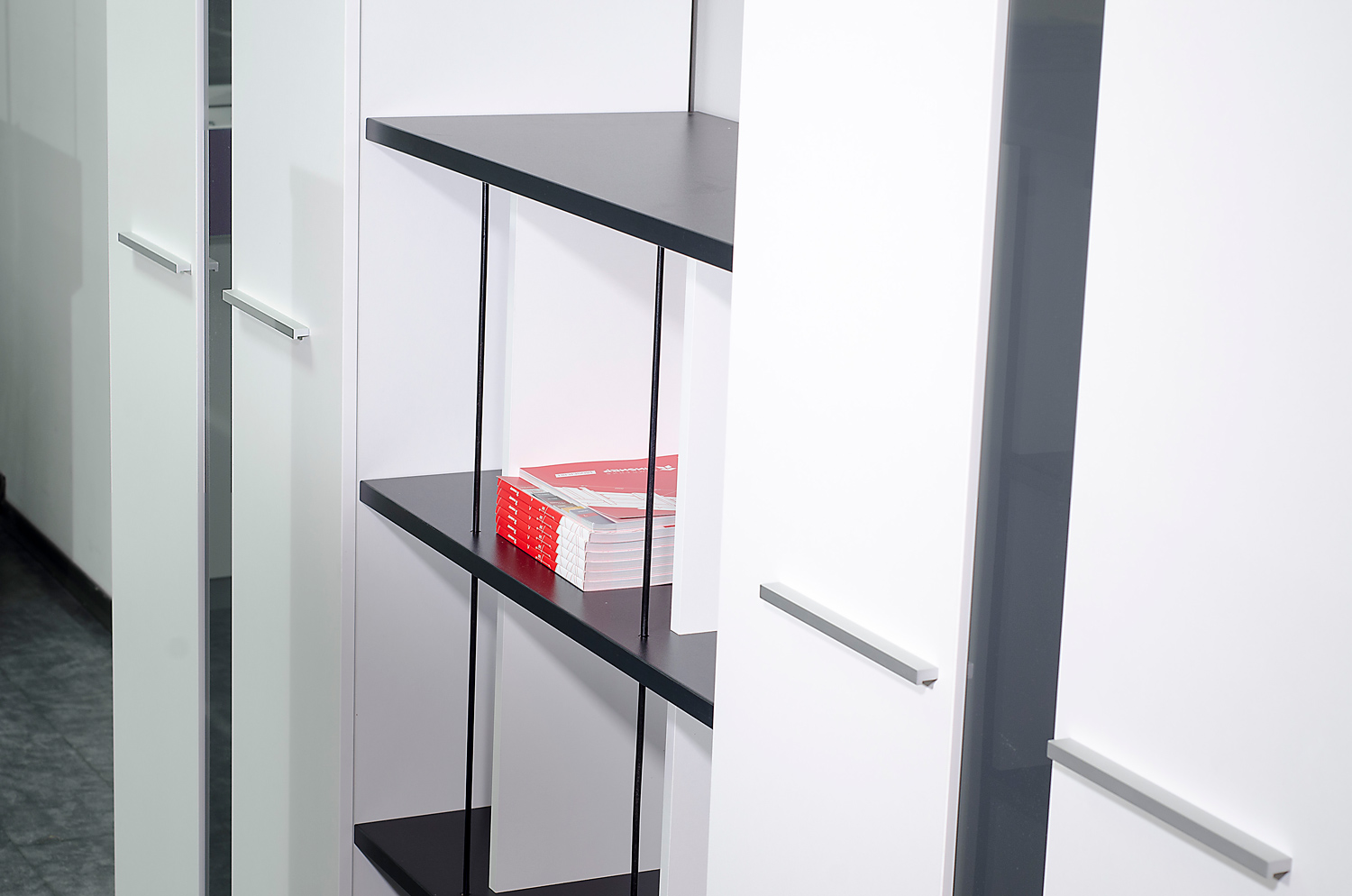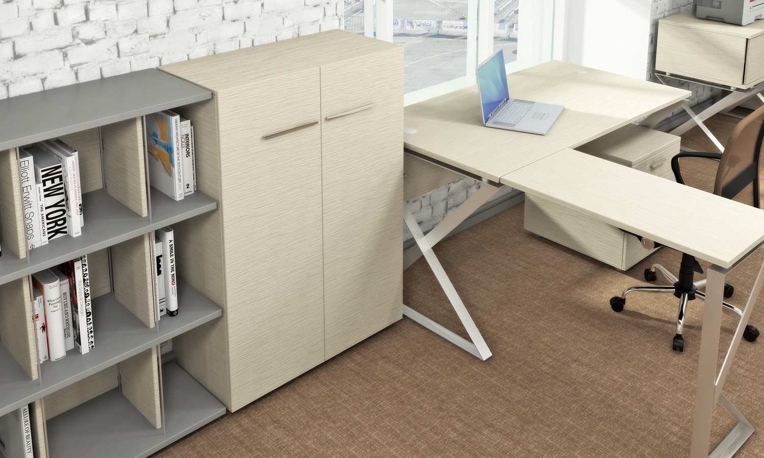 Запатентованные стальные опоры письменных столов, не имеющие аналогов в мировой мебельной промышленности. Системы закрытого хранения выполнены нарочито нейтрально, чтобы подчеркнуть уникальный дизайн столов и стеллажных систем.