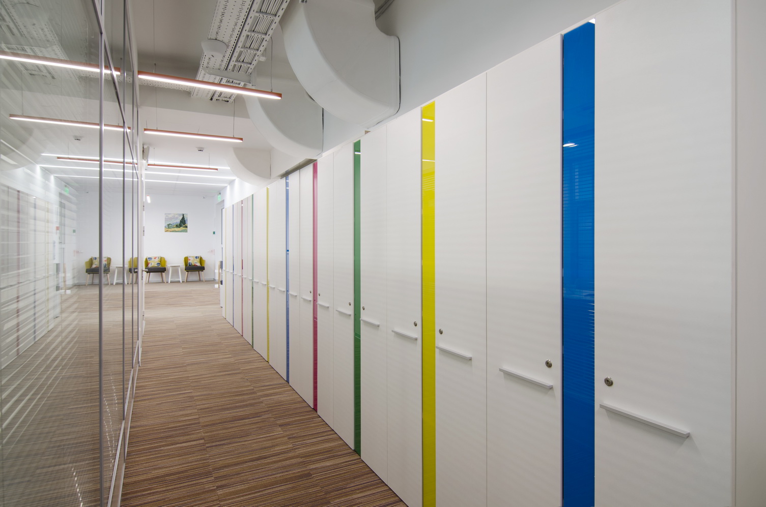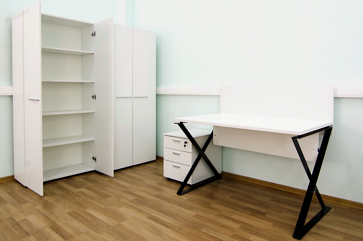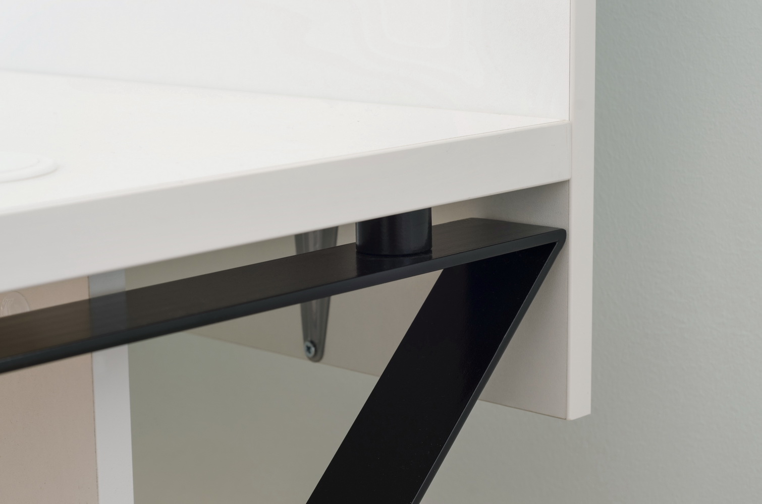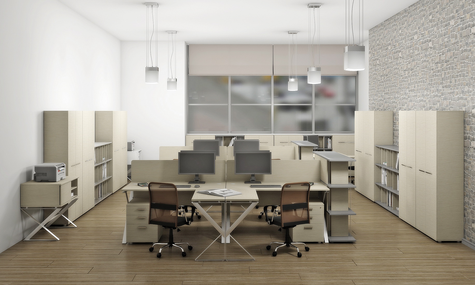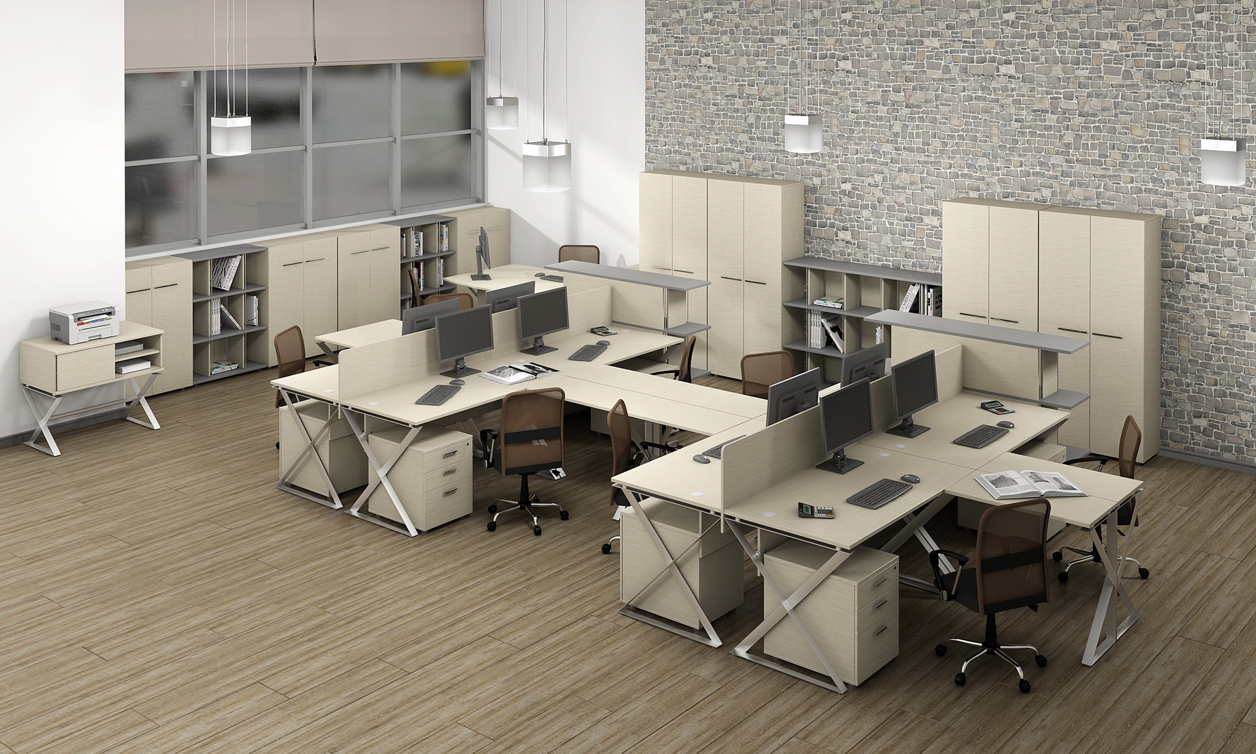 Запатентованные стальные опоры письменных столов, не имеющие аналогов в мировой мебельной промышленности. Системы закрытого хранения выполнены нарочито нейтрально, чтобы подчеркнуть уникальный дизайн столов и стеллажных систем.