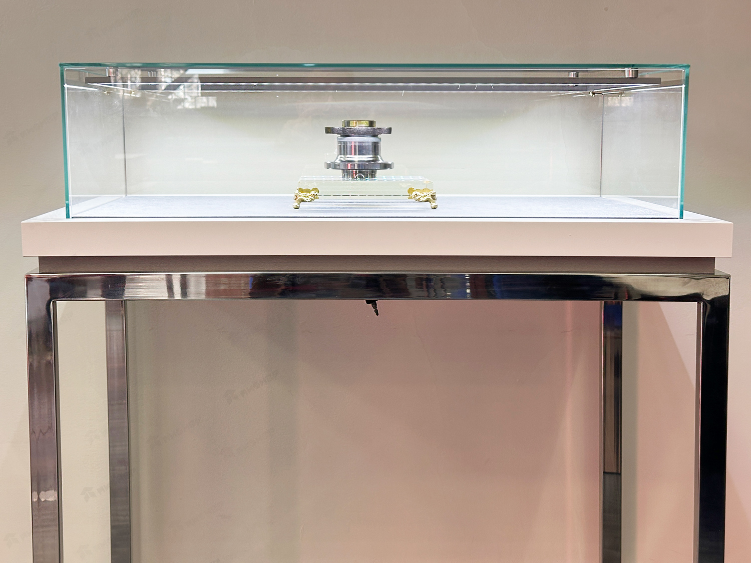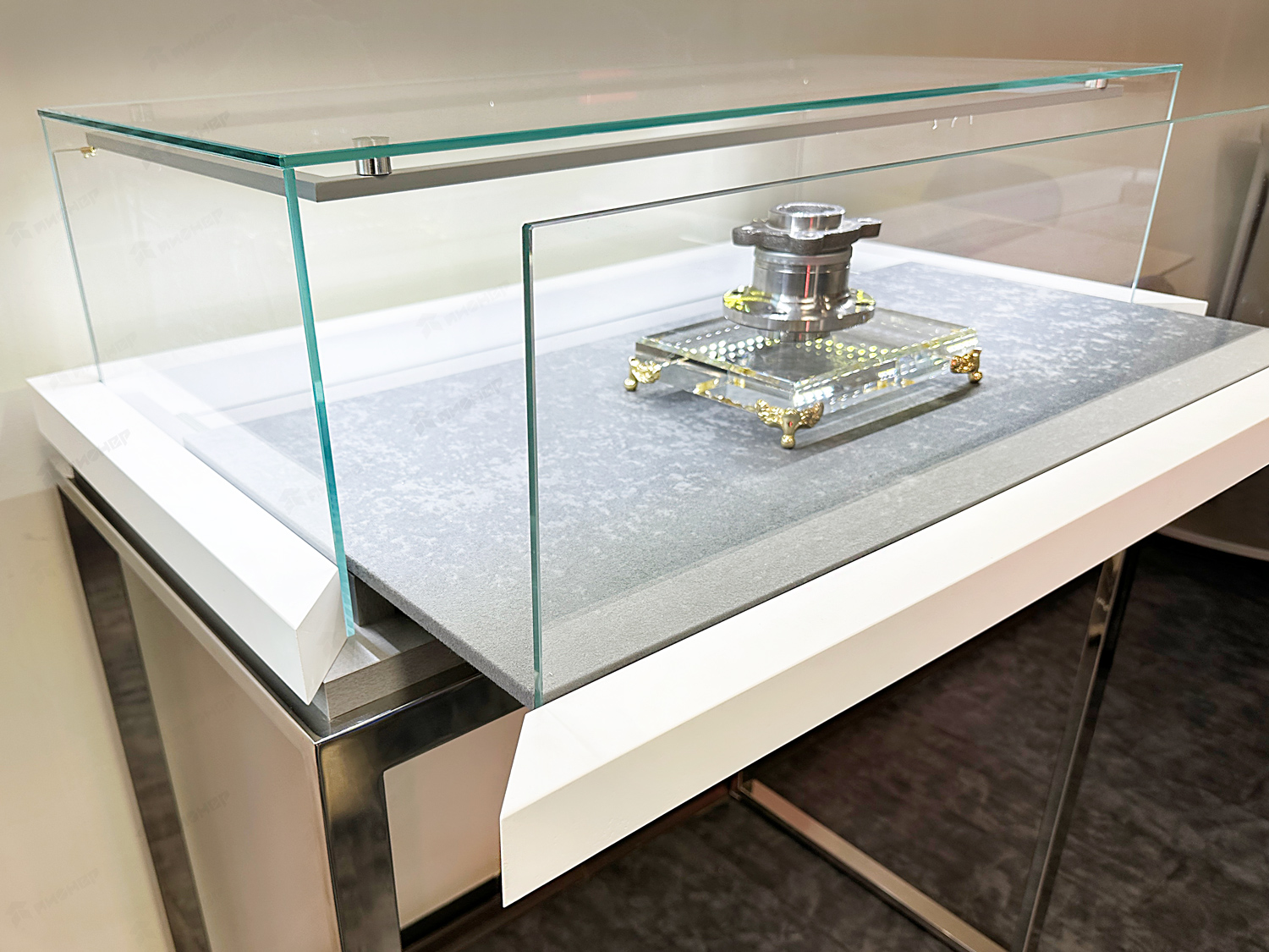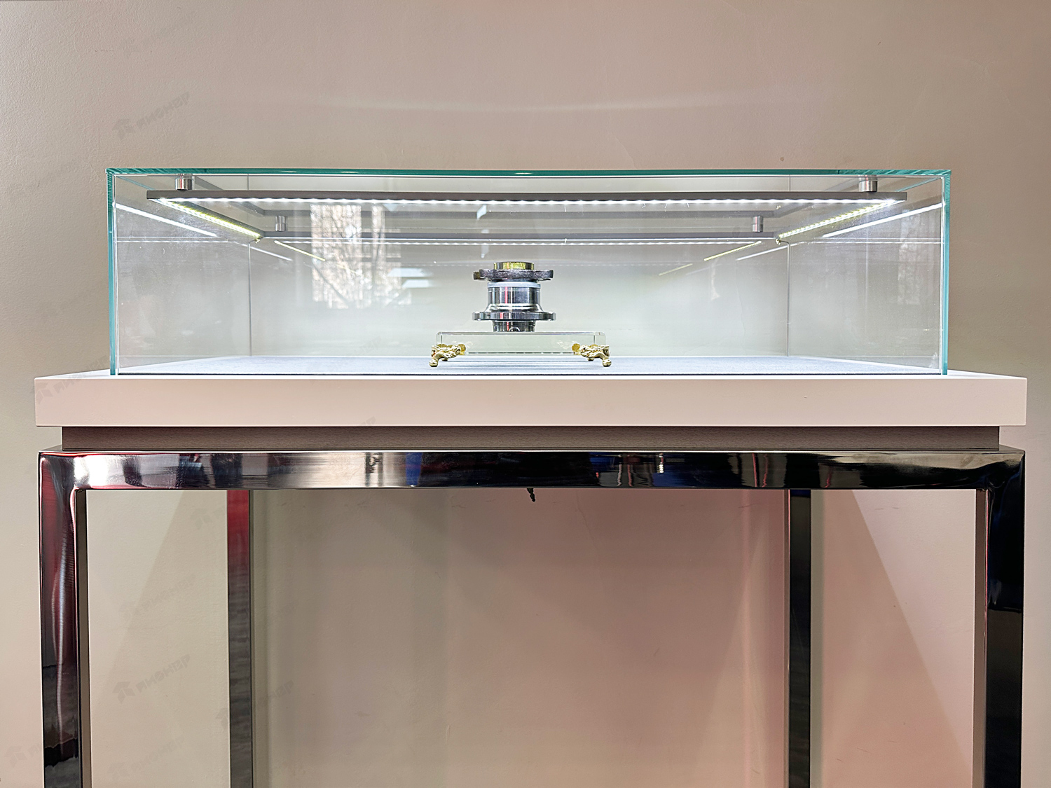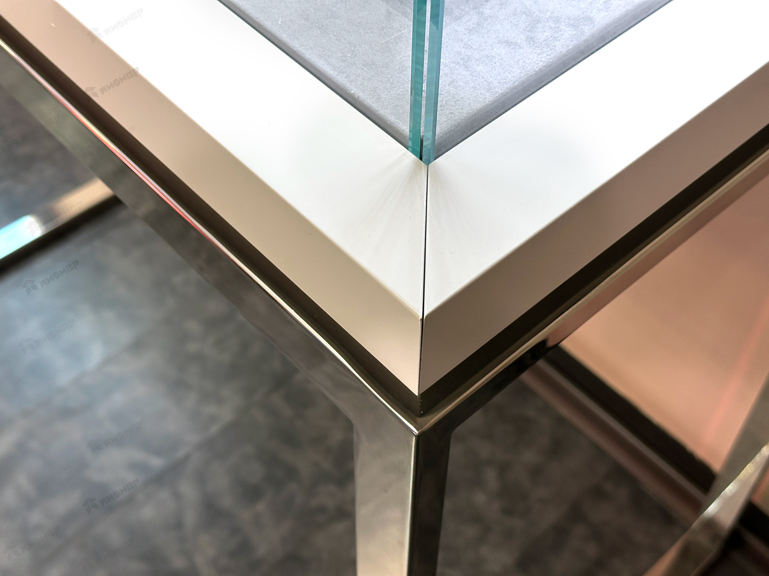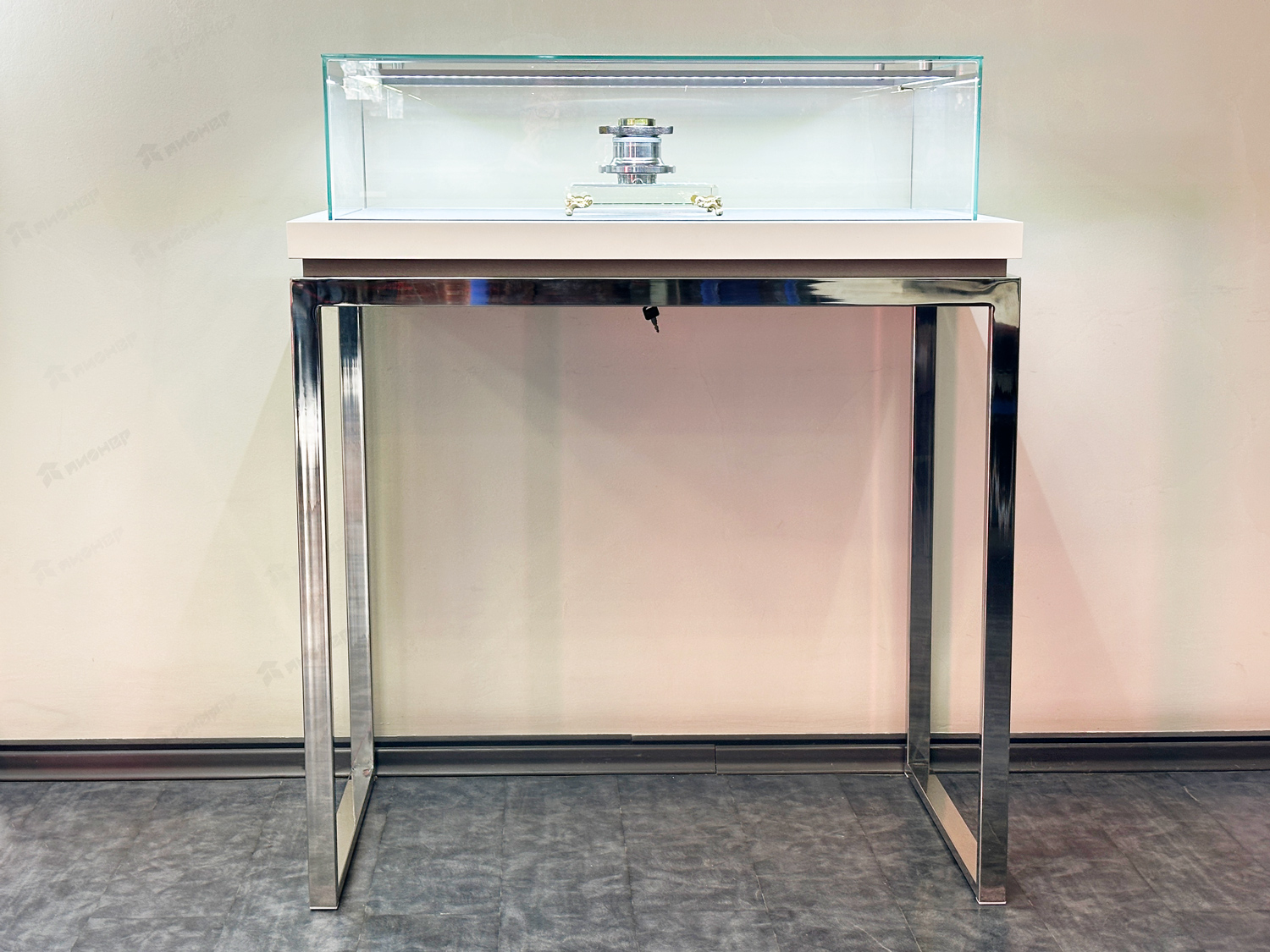 Витрина с опорами из нержавеющей стали, это большое преимущество этой витрины - красиво, прочно и вечно. Витрина хорошо подходит для демонстрации ювелирных изделий и музейных ценностей.