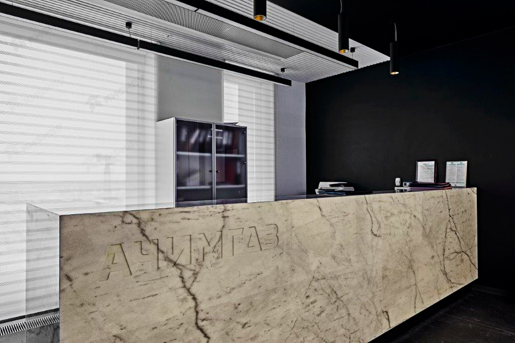 Полированный мрамор на верхней и на боковой поверхности дал стопроцентное отражение, и на фото выглядит зеркальным. Фронтальная поверхности ресепшн тоже отполирована, но на фото не дала блик.
