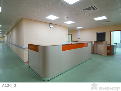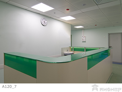 Стеклянные элементы стойки выглядят ярким акцентом на фоне стены в пастельных тонах, а хромированный цоколь зеркально отражает цвет пола. Таким образом, стойка объединяет детали интерьера медицинского центра.