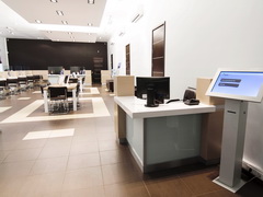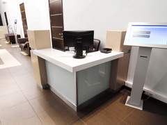 Стойка митера-гритера для офиса ВТБ выполнена в едином ключе с операционным залом банка.