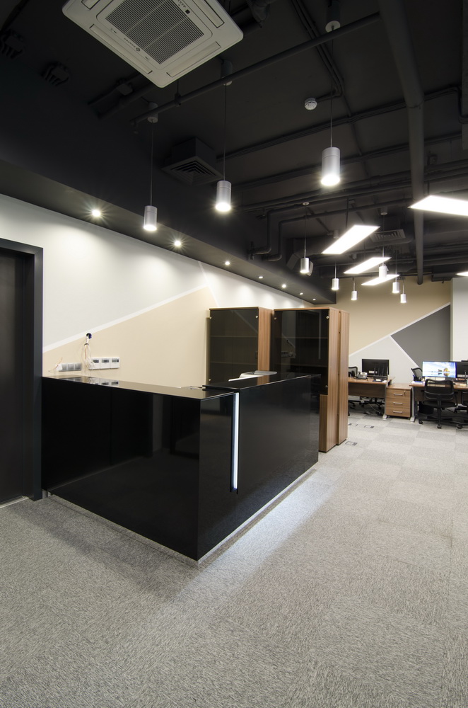 Благодаря сильно заглубленному цоколю, выполненному из зеркального металла, внешне массивная стойка как бы парит в воздухе.
